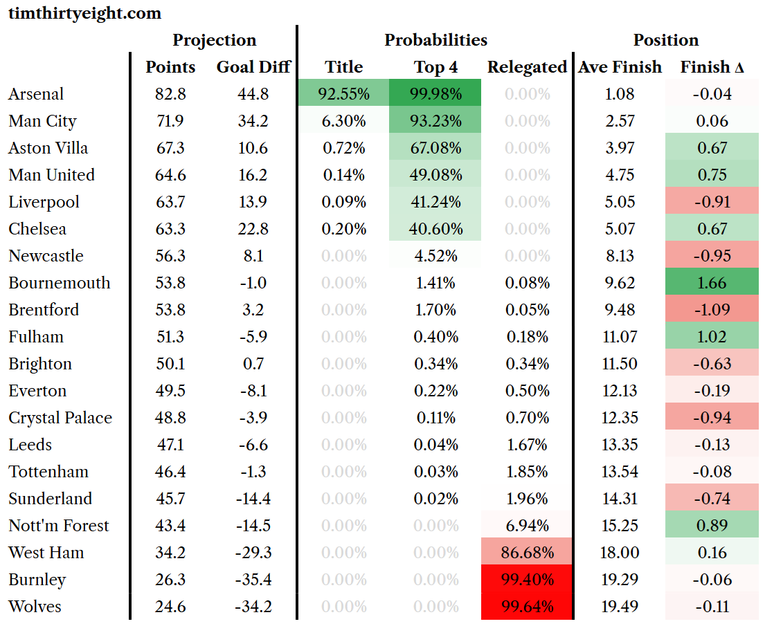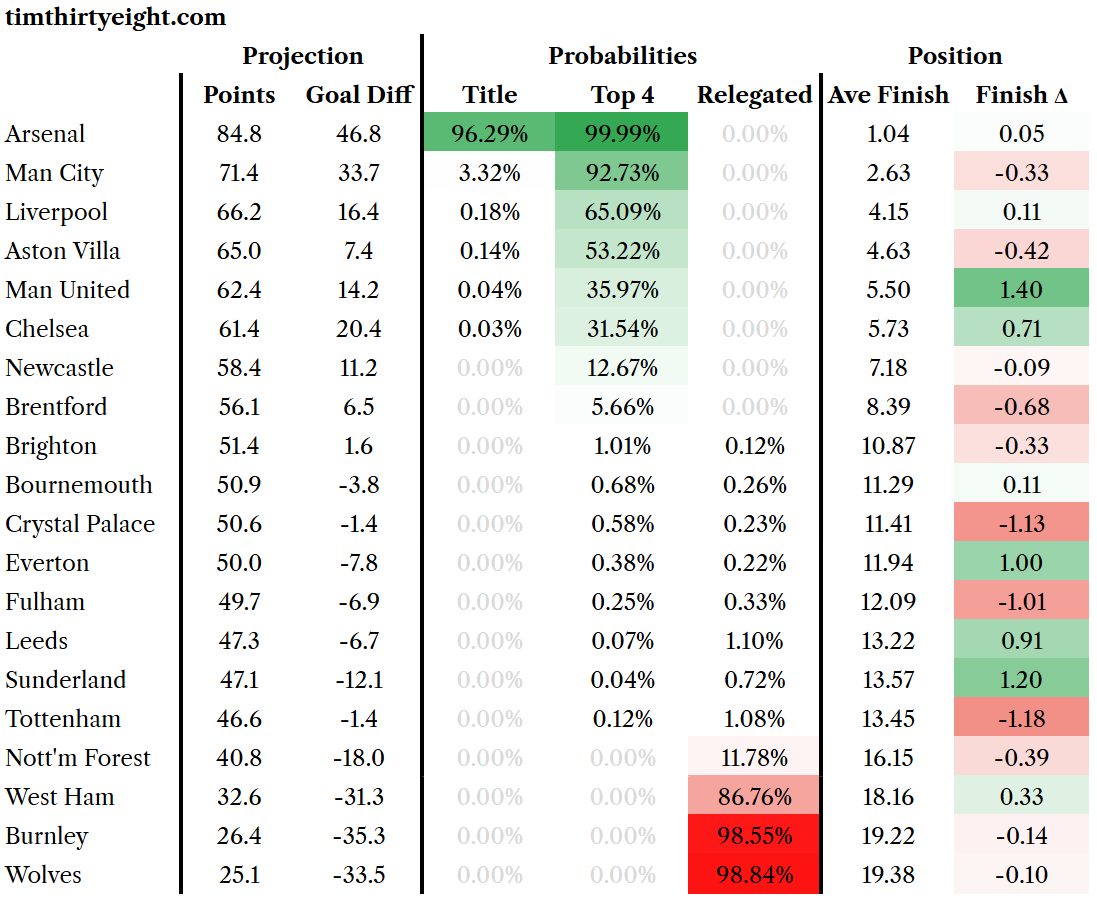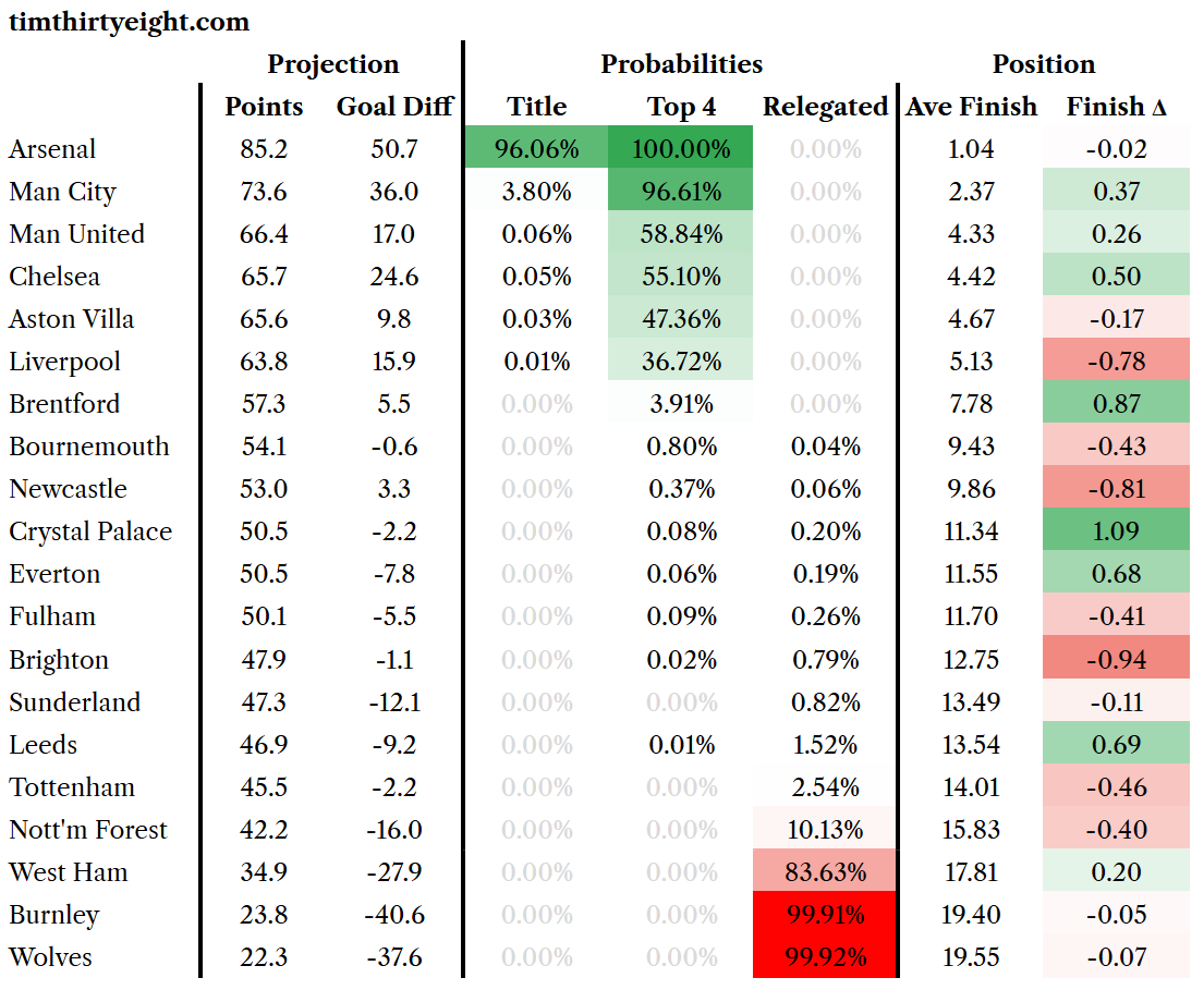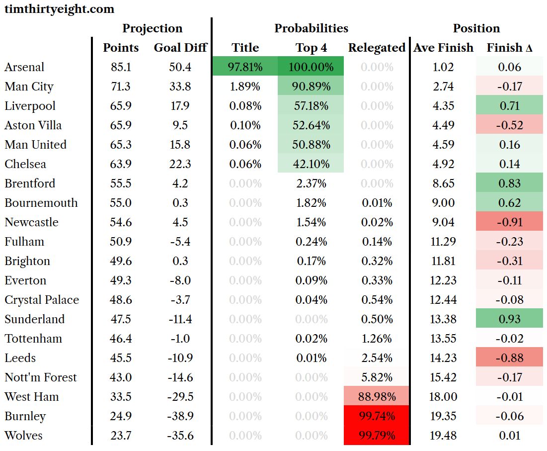 Finish Delta is from the “start of the season” simulation that I ran quickly.. definitely take those with a grain of salt. 19 gameweeks is enough time for the Glicko ratings to catch up and get us slightly better ideas of how good the teams are.