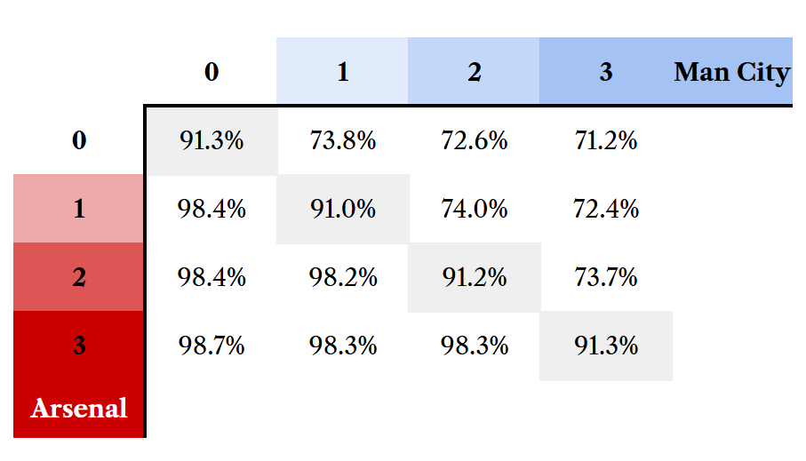 Obviously I’m being facetious, it does matter who wins between the top two in the Premier League in deciding the outcome, but interestingly it matters less than I’d expect. I ran 25,000 simulations for each scoreline below to see the resulting chances in Arsenal winning the title: