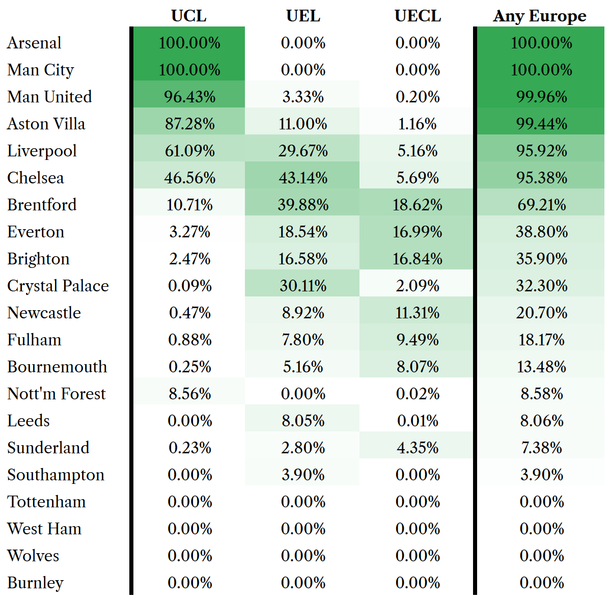 Anyway below is my best attempts to give each team’s potential to qualify for 2027 European competitions. I’ll update this after each Premier League round and after each round of European fixtures concludes.