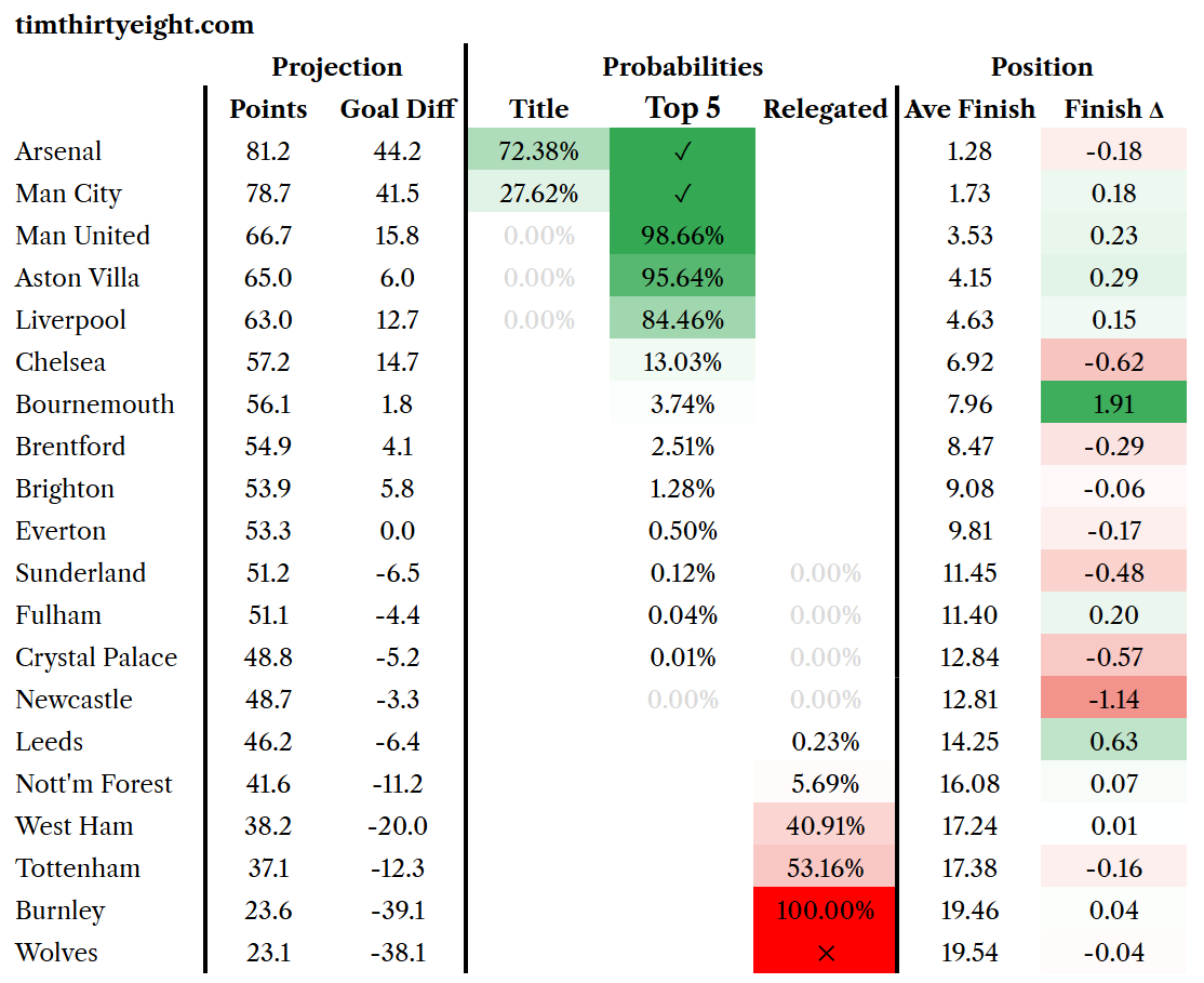 Premier League Table & European Qualification Prediction 2026-04-21 21 Apr Written By Tim Bullen I stand by my Bear Sterns Arsenal optimism. Download Raw Data in .csv Download Raw Data in .csv Tim Bullen